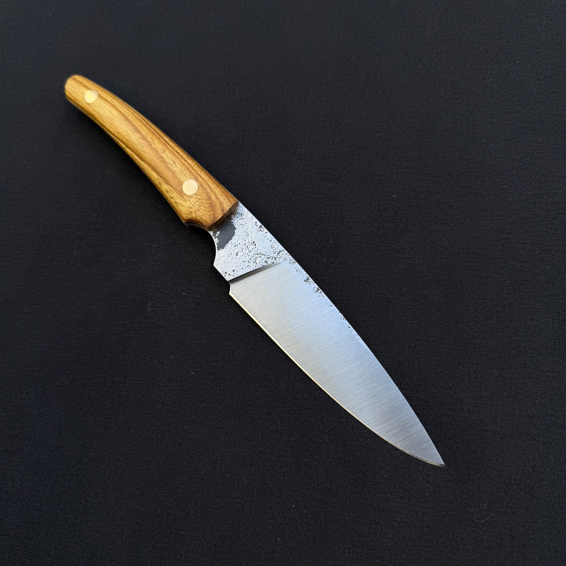 Lame de 9 cm forgée en XC75, manche en Laburnum Vosgien monté sur vis Corby laiton pour une longueur totale de 21 cm.
