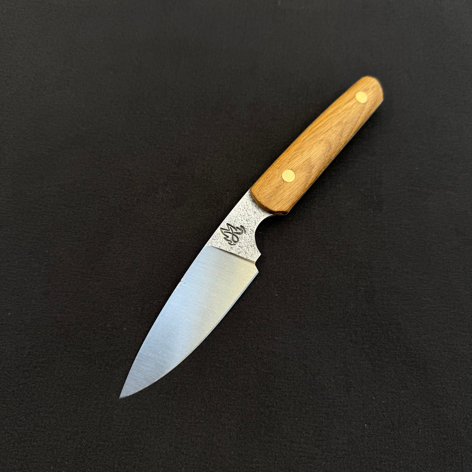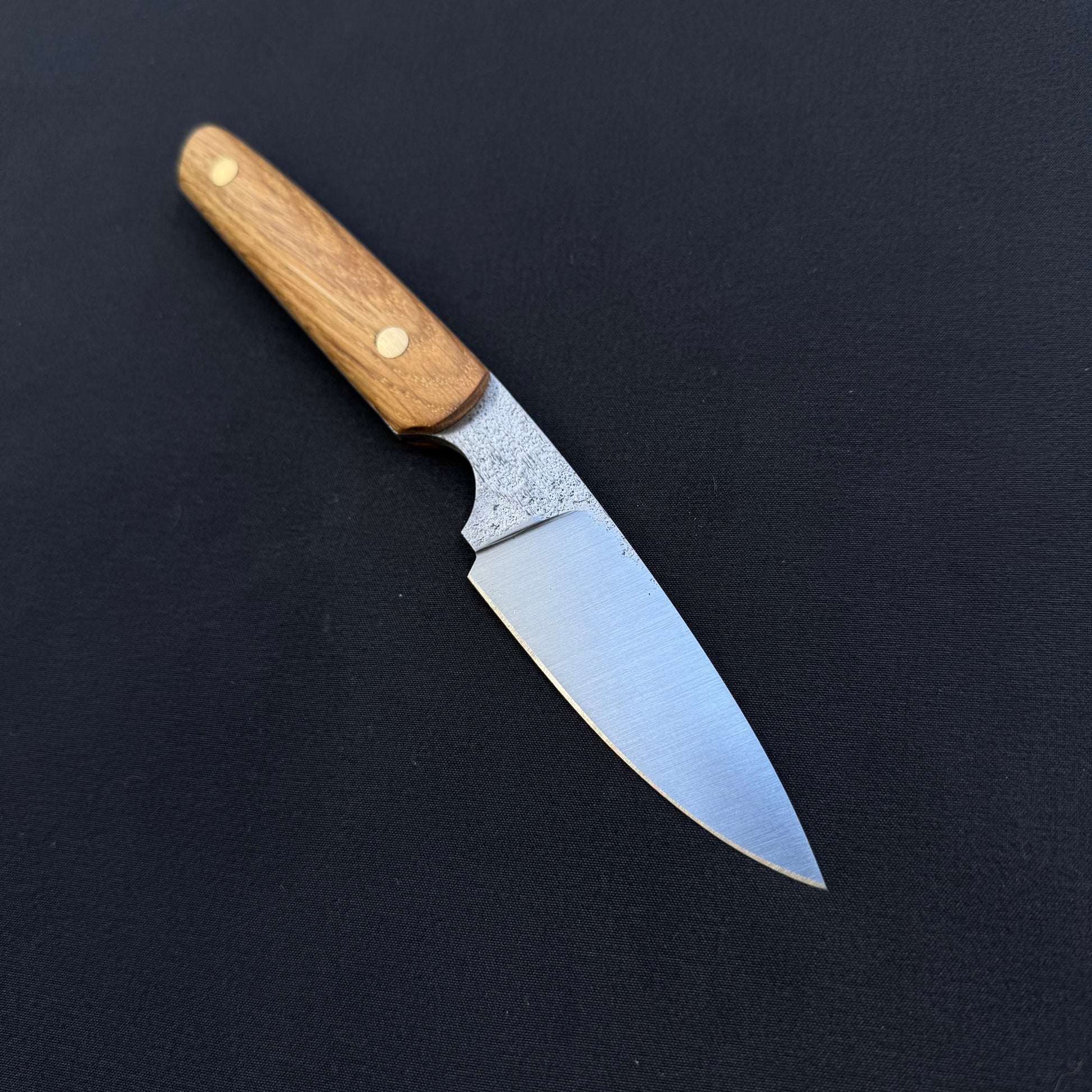 Lame de 7,5 cm forgée en XC75, manche en Chêne Vosgien monté sur vis Corby laiton pour une longueur totale de 19,5 cm.