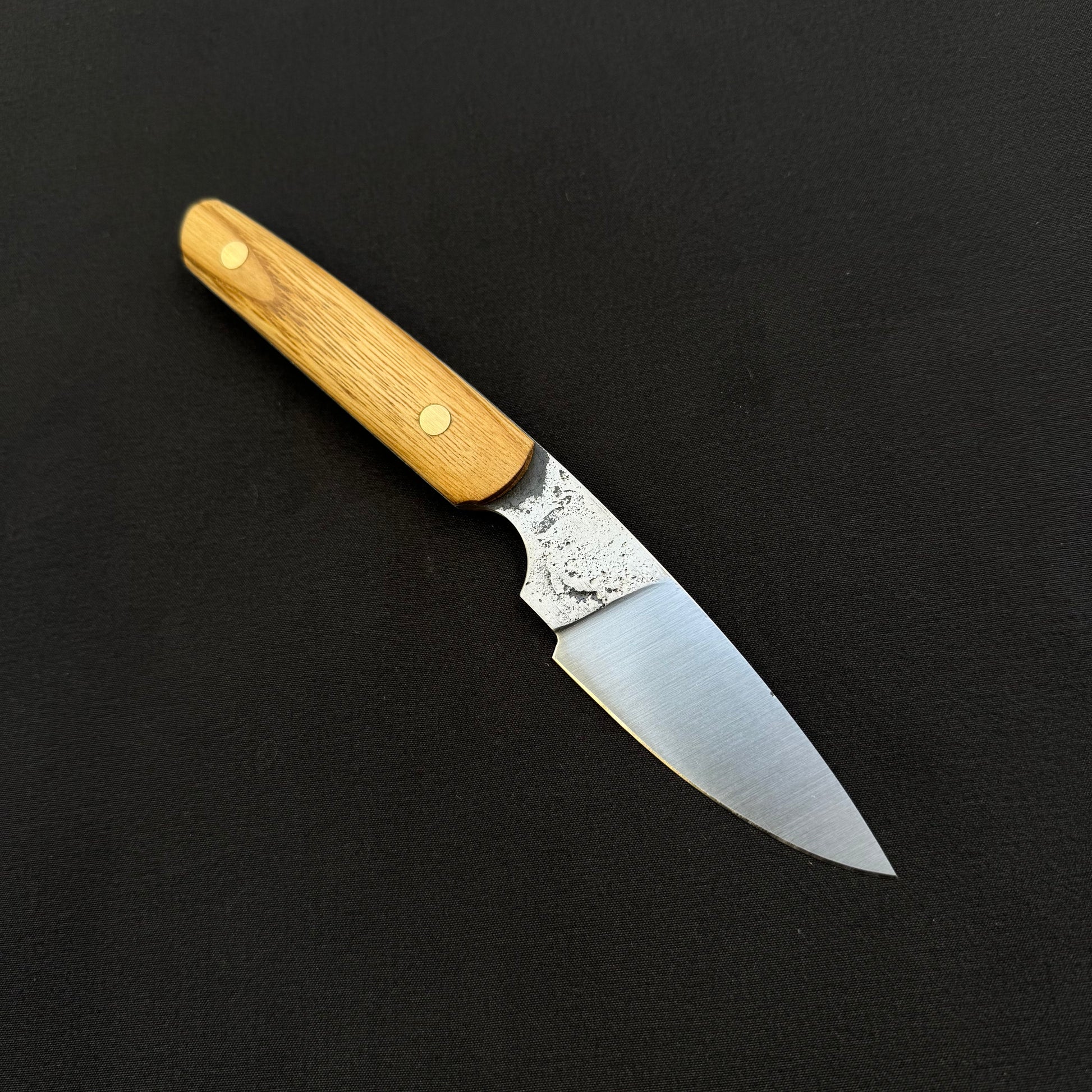 Lame de 7 cm forgée en XC75, manche en Châtaignier monté sur vis Corby laiton pour une longueur totale de 19, cm.