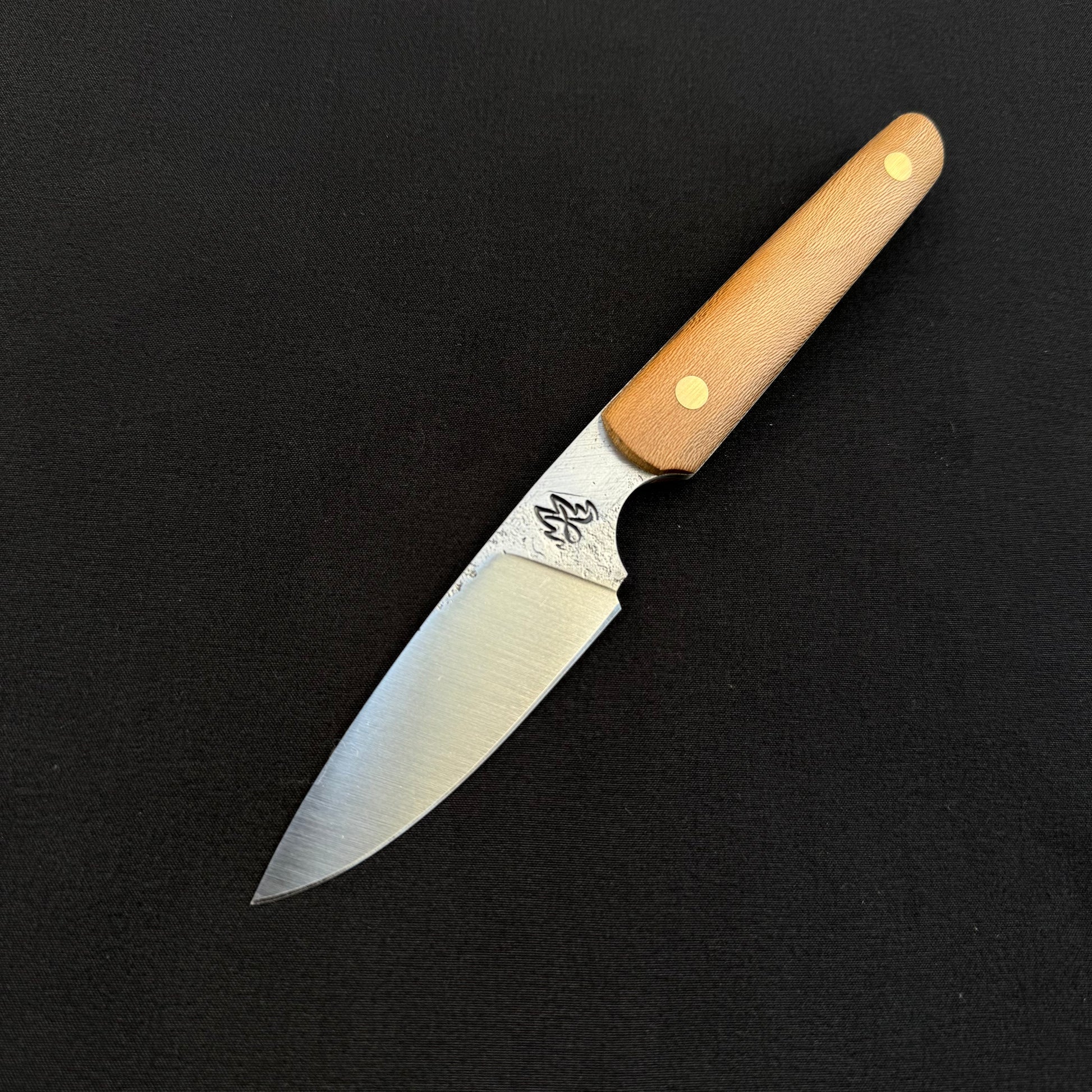 Lame de 7,5 cm forgée en XC75, manche en Chêne Rouge d’Amérique monté sur vis Corby laiton pour une longueur totale de 19,5 cm.