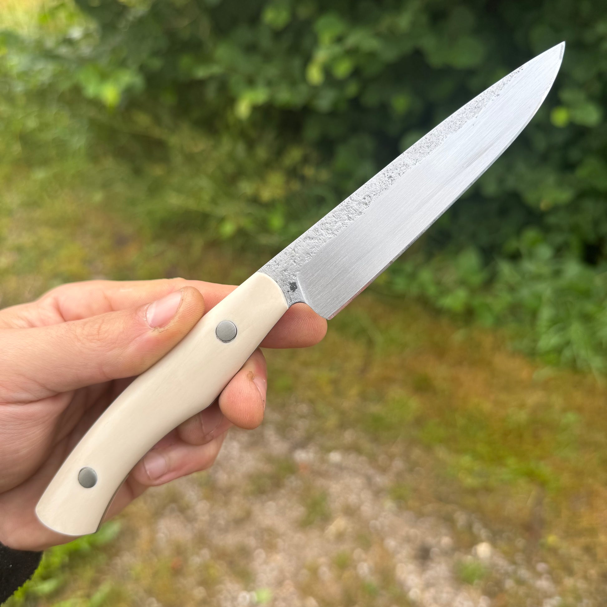 Lame de 11 cm forgée en 90mcv8 finition tiré en long à la pierre, manche en Elforyn ( Ivoire synthétique ) monté sur vis Corby inox pour une longueur totale de 22 cm.