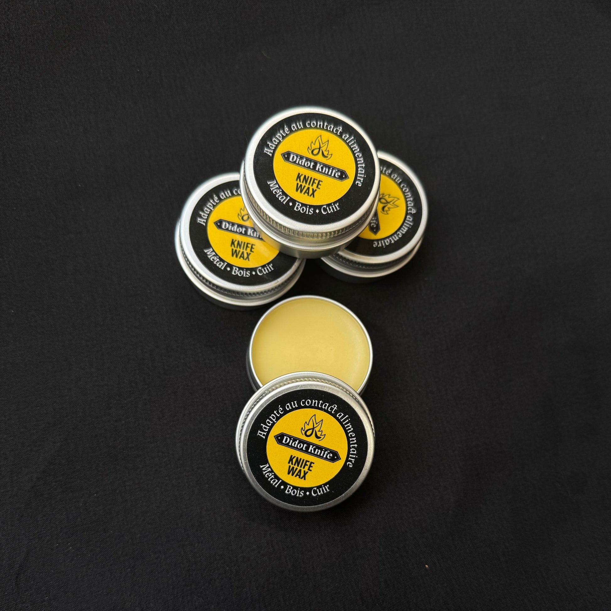 Knife-Wax Métal, Bois et Cuir de DidotKnife ! Un baume d’entretien pour couteau, à base de cire d’abeilles Vosgienne et d’huile minérale, ce baume protègera vos lames en acier carbone de l’humidité ainsi que le bois de vos manches tout en le nourrissant et en lui redonnant tout son éclat !