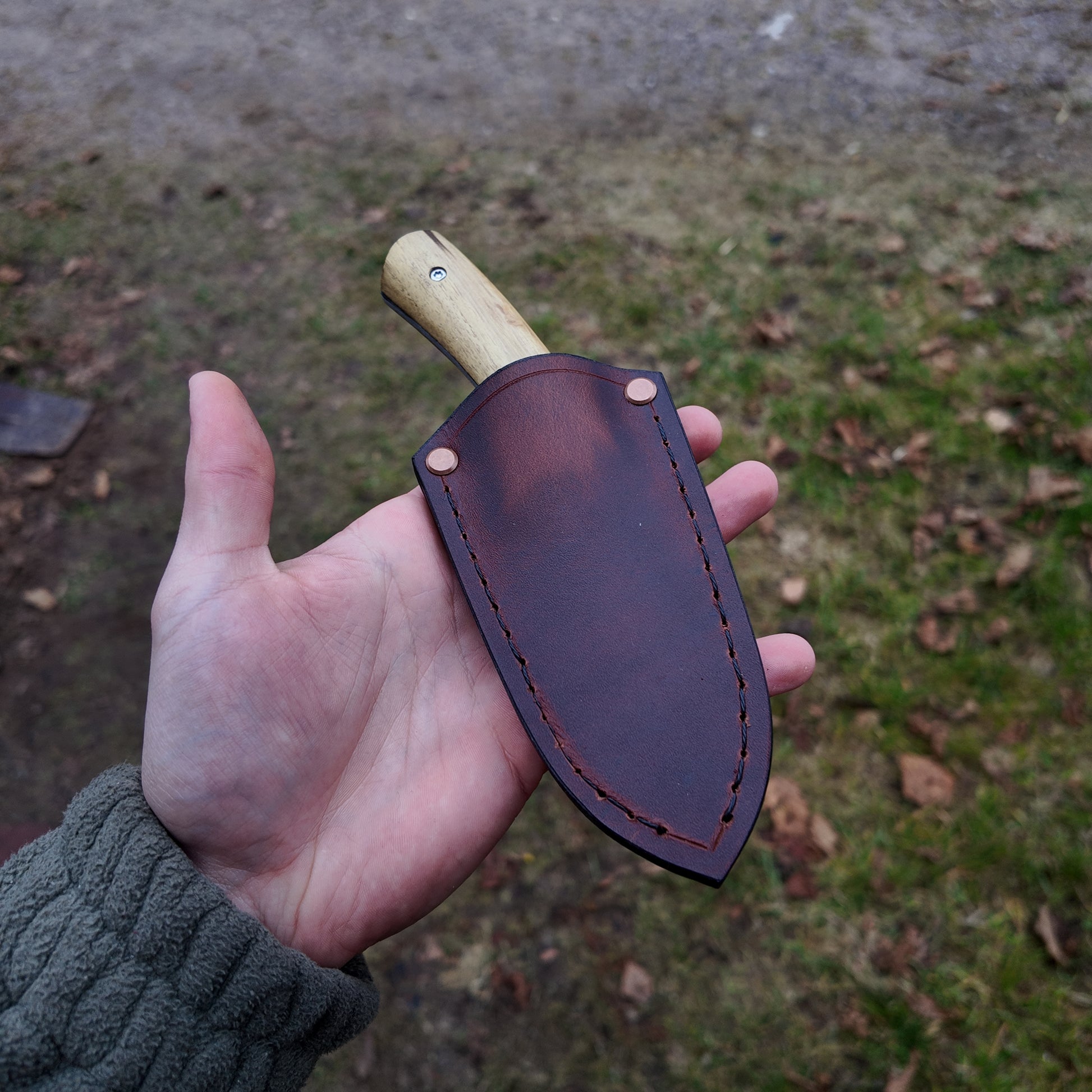 Forgé en 90mcv8, lame courte et large, tranchant de 7 cm le long, manche en Acacia Vosgien monté sur vis inox têtes bombées.