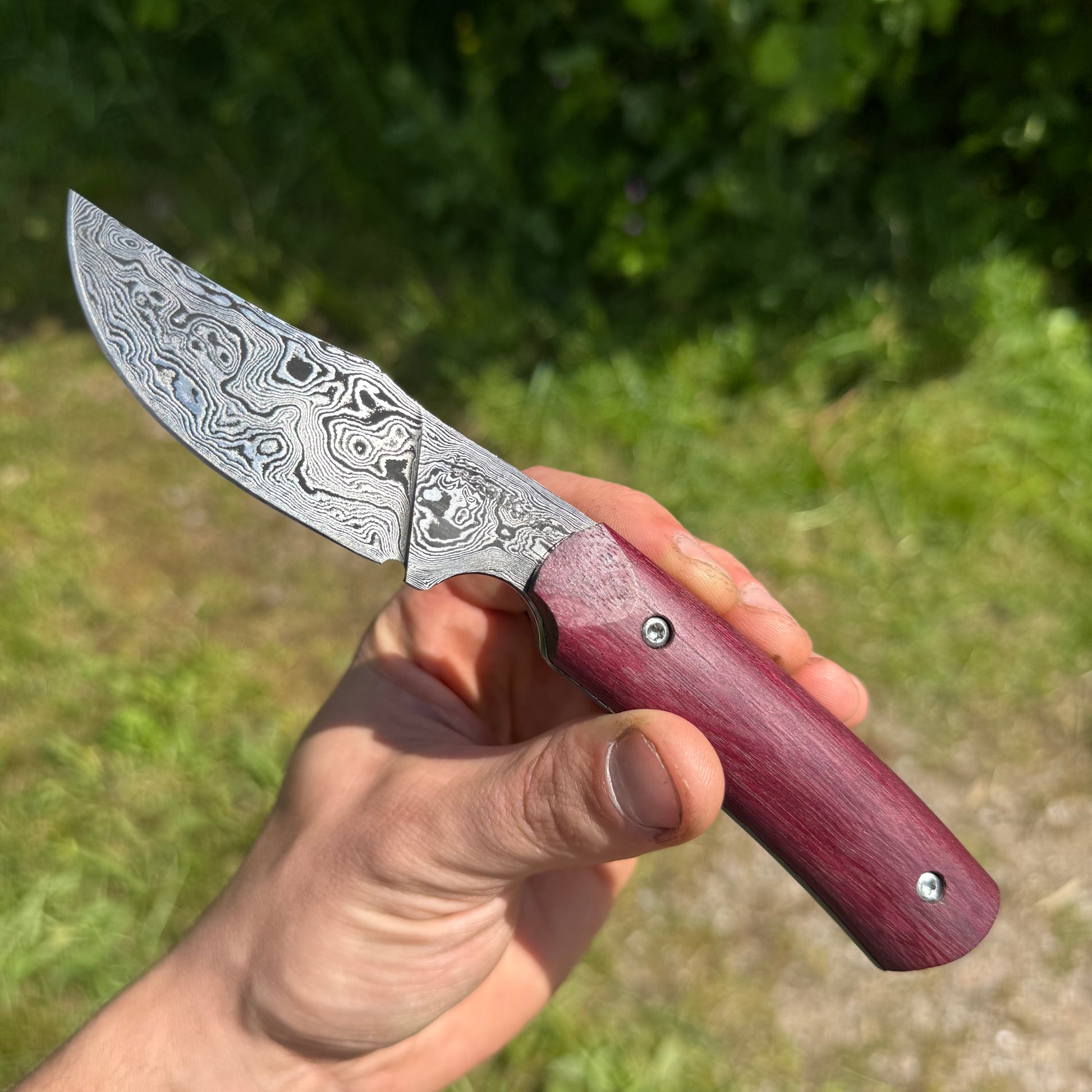 Forgé en acier feuilleté 160 couches 90mcv8 et 15n20, tranchant de 7 cm le long manche en Amarante de Guyane monté sur vis inox têtes bombées.