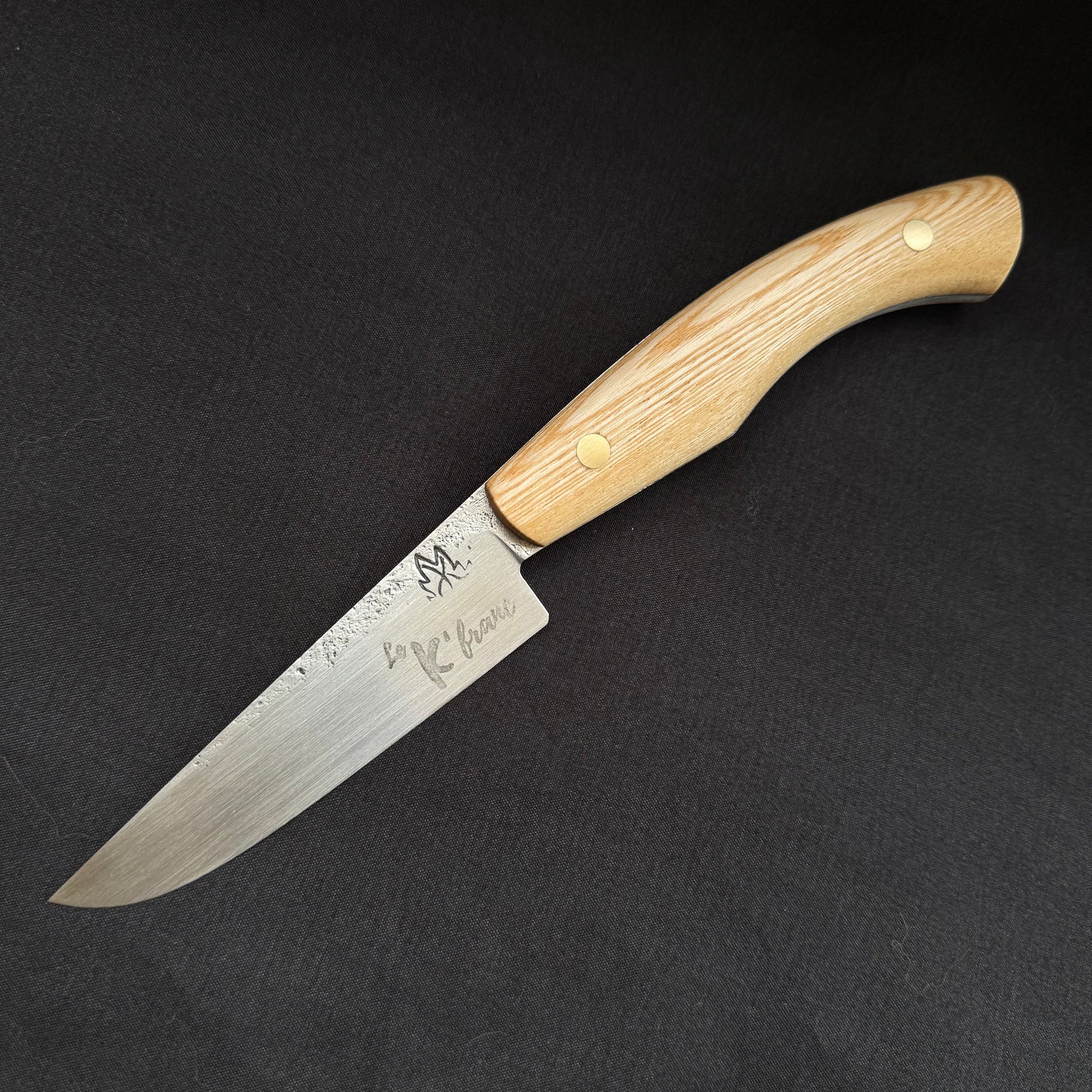 Lame de 9,5 cm forgée en 90mcv8 finition tiré en long à la pierre, manche en Frêne Vosgien monté sur vis Corby laiton pour une longueur totale de 21,5 cm.