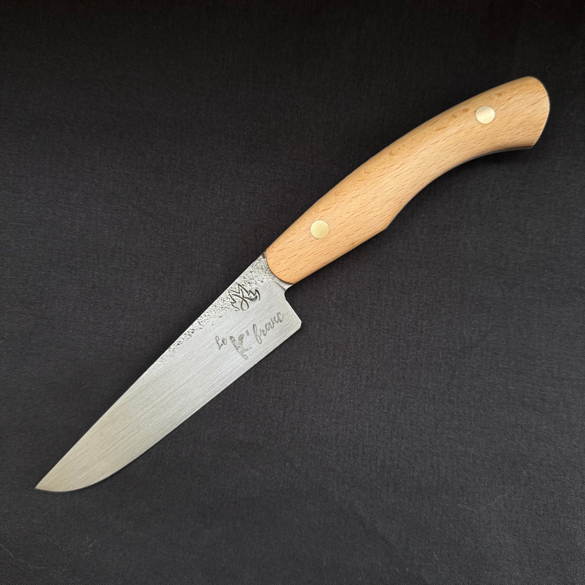 Lame de 10 cm forgée en 90mcv8 finition tiré en long à la pierre, manche en Hêtre Vosgien monté sur vis Corby laiton pour une longueur totale de 21,5 cm.