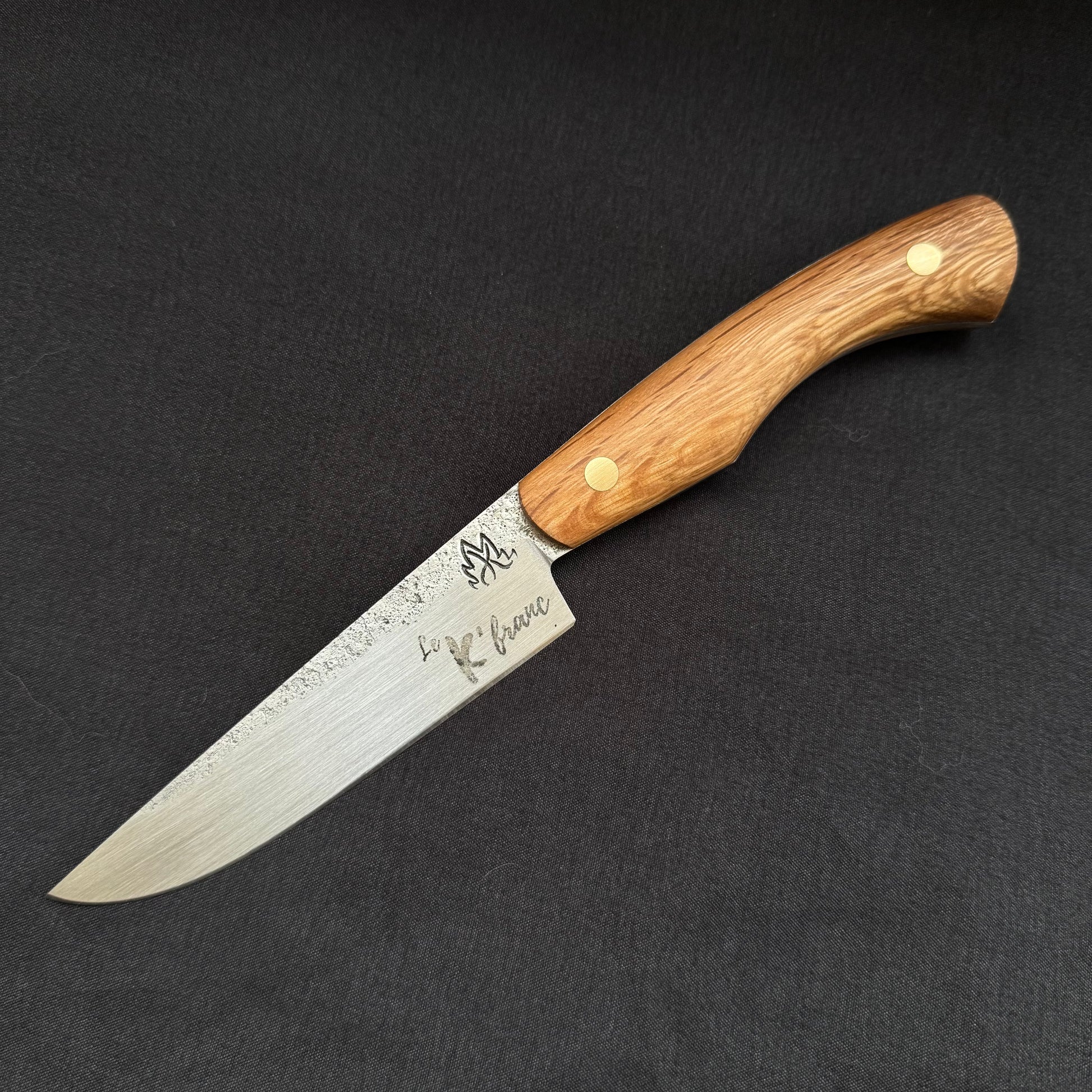 Lame de 10 cm forgée en 90mcv8 finition tiré en long à la pierre, manche en Chêne vert l’Ardèche monté sur vis Corby laiton pour une longueur totale de 21 cm.