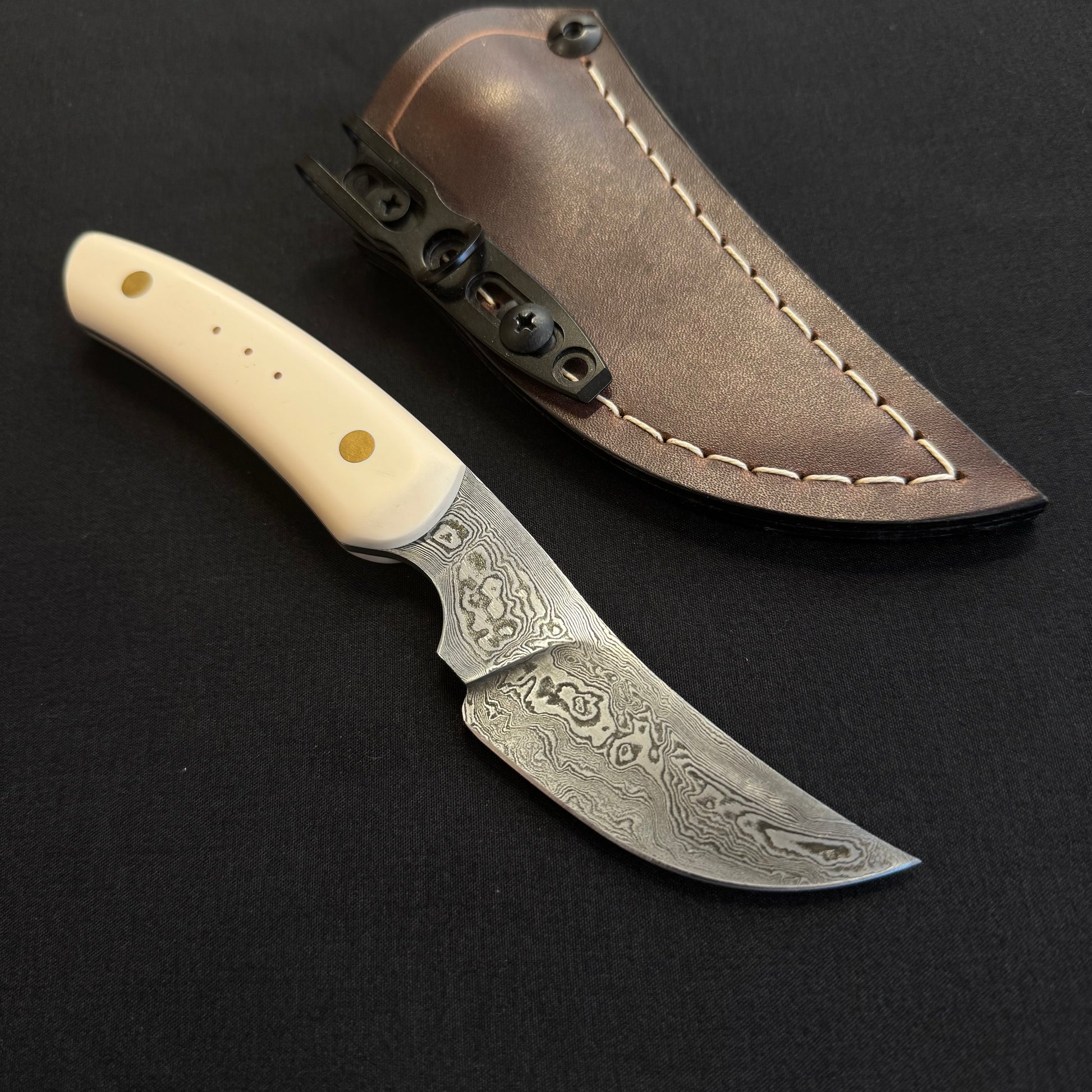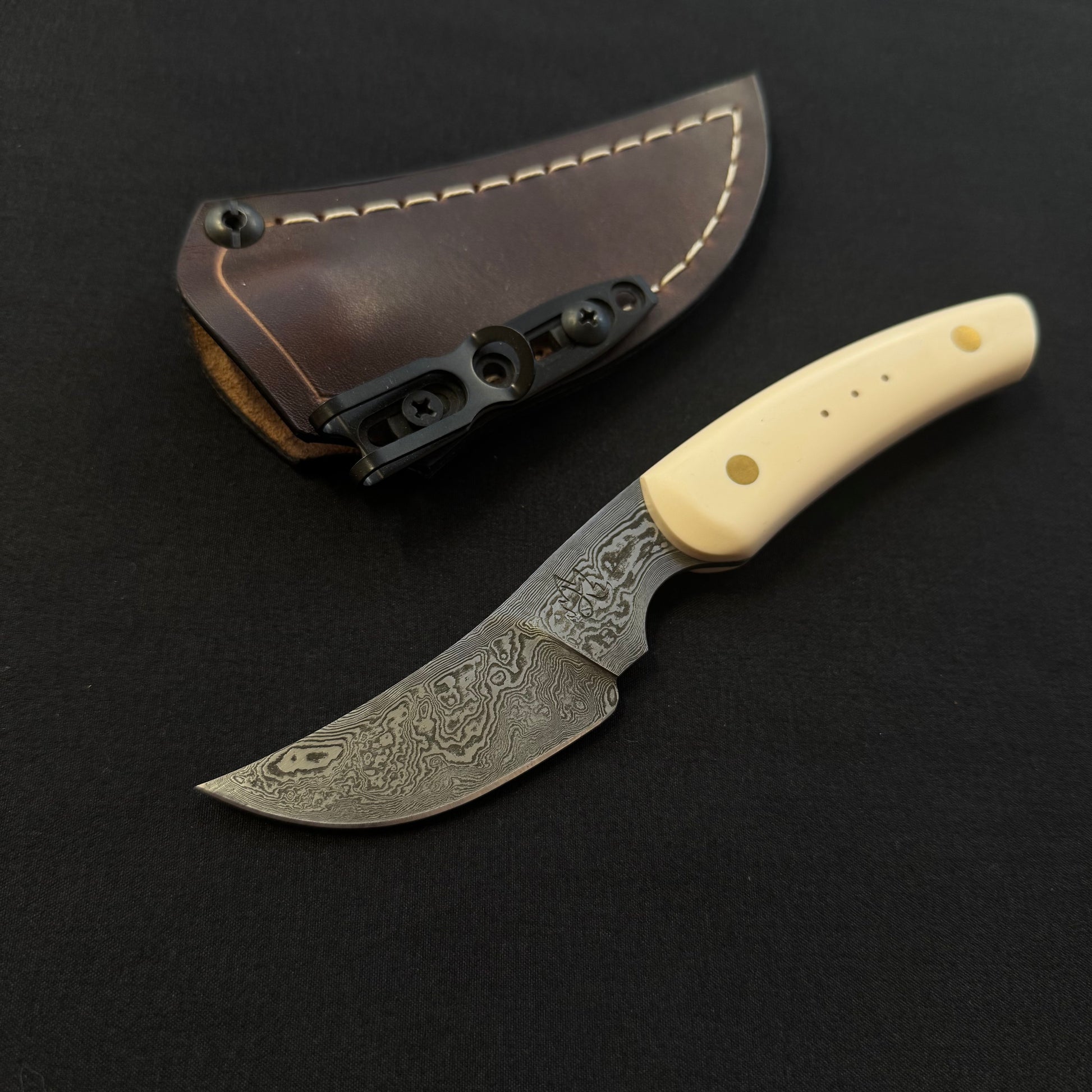 Forgé en acier feuilleté 160 couches 90mcv8 et 15n20, tranchant de 7 cm le long manche en Elforyn monté sur vis Corby laiton. Insert cuivre marquant La Trinité.