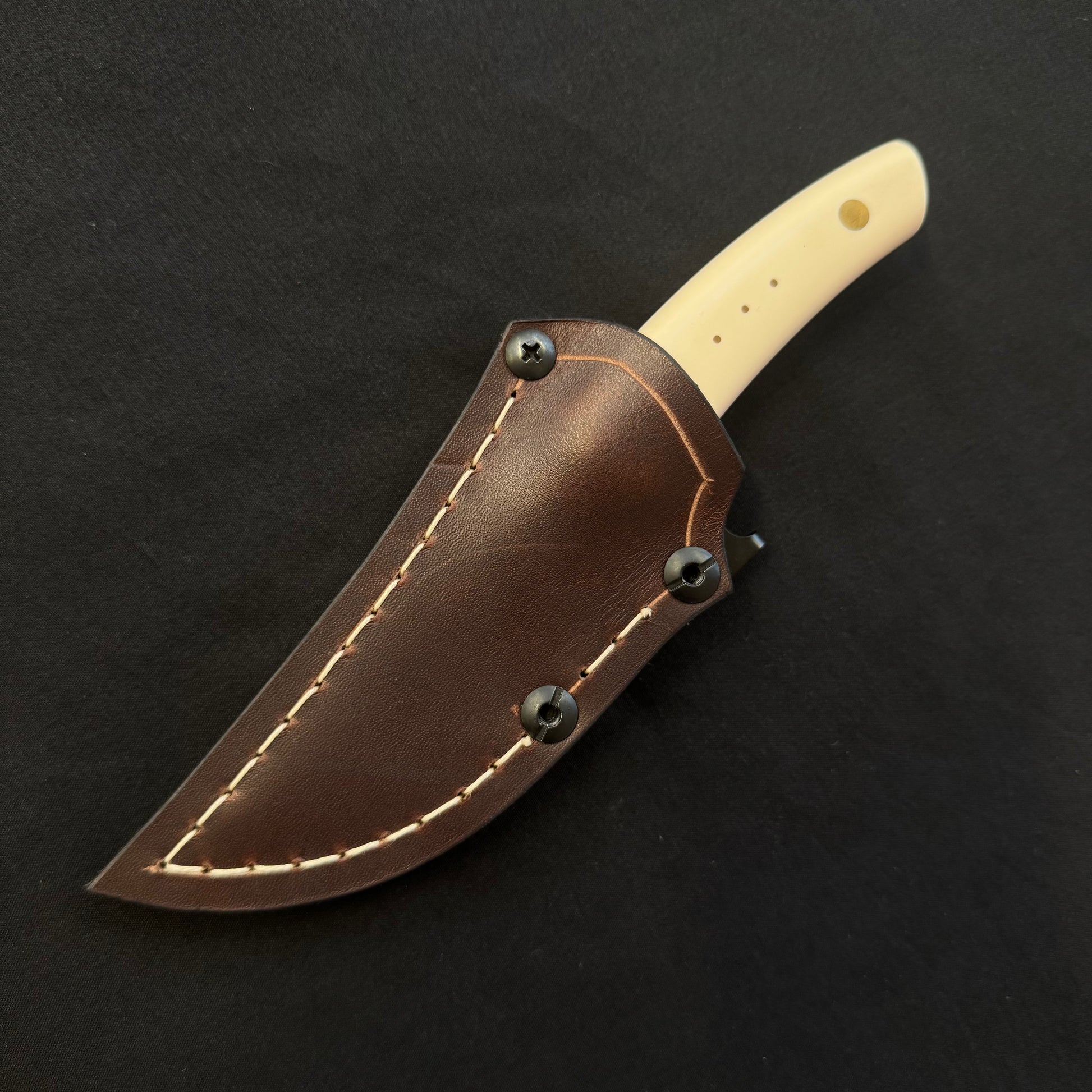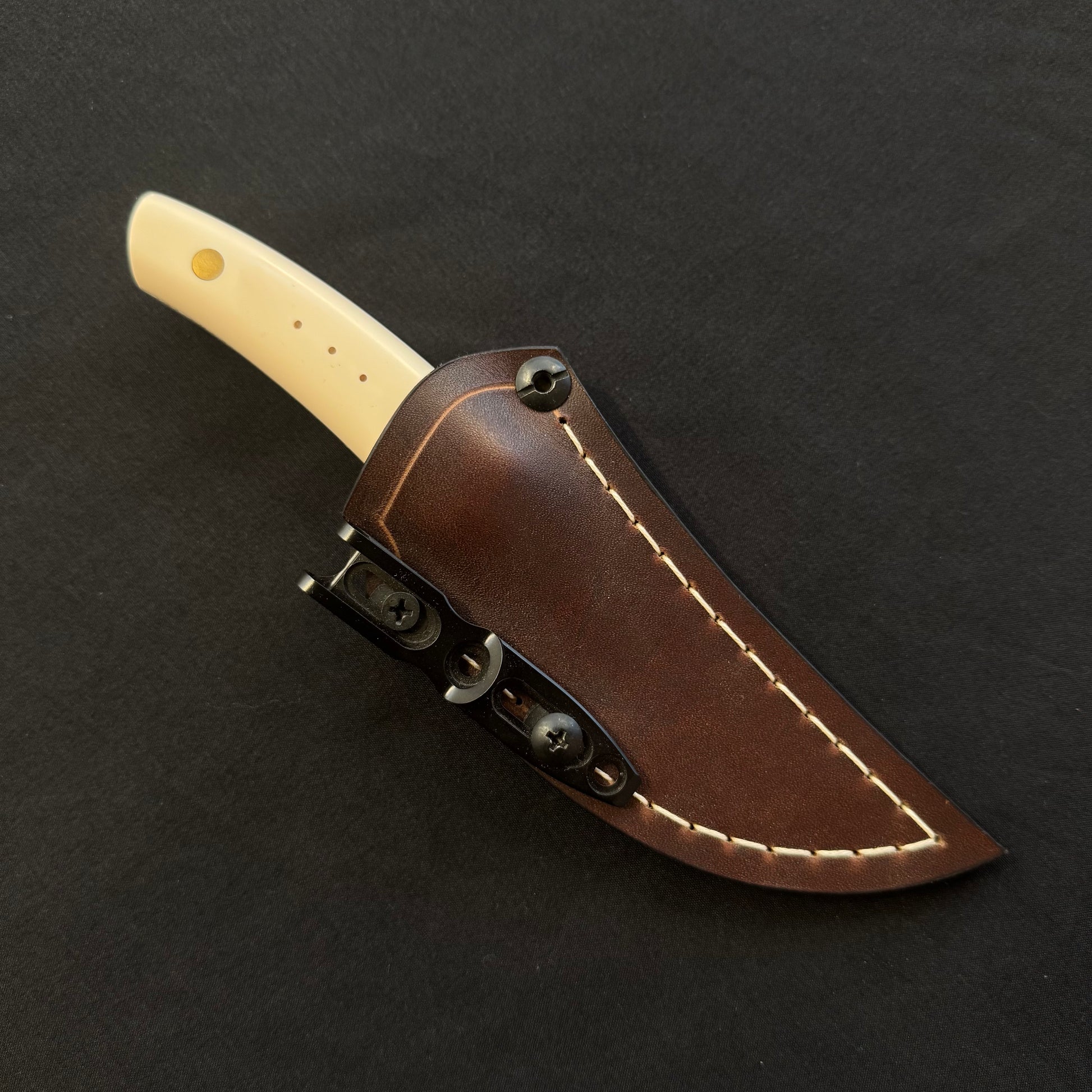 Etui Cuir croupon Colorado tannage végétal cousu main avec du fil de lin ciré blanc. Clip de poche noir réversible droitier ou gaucher.